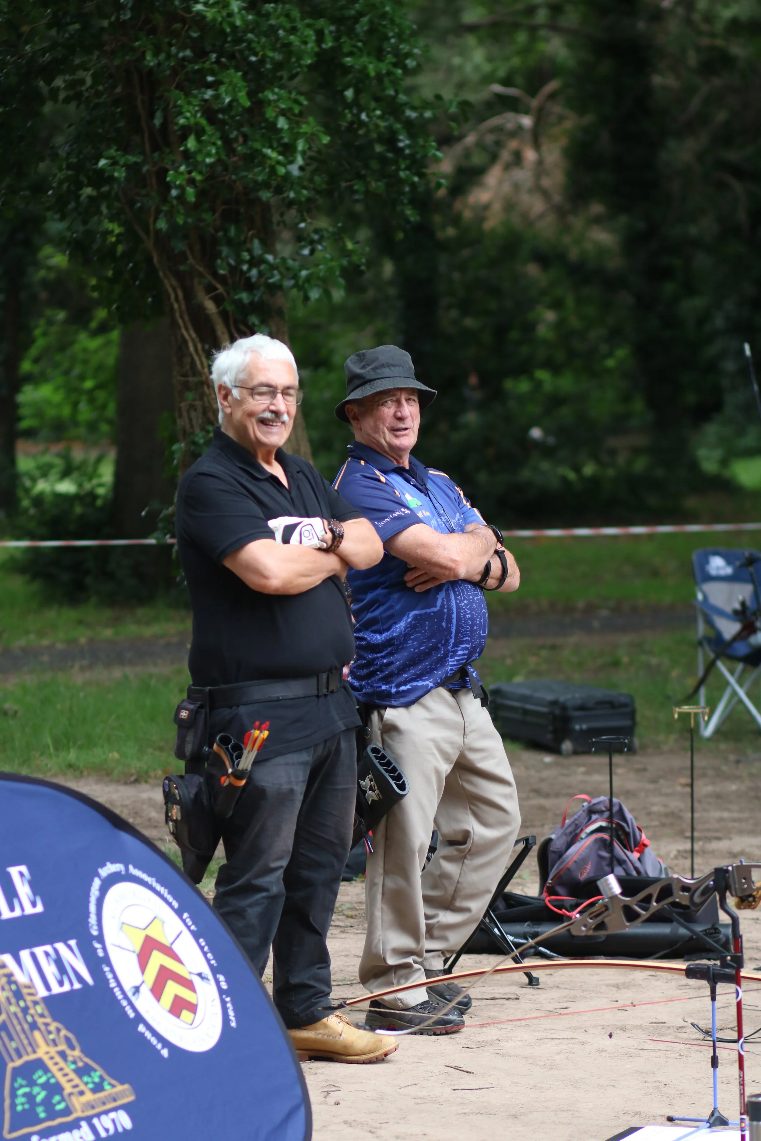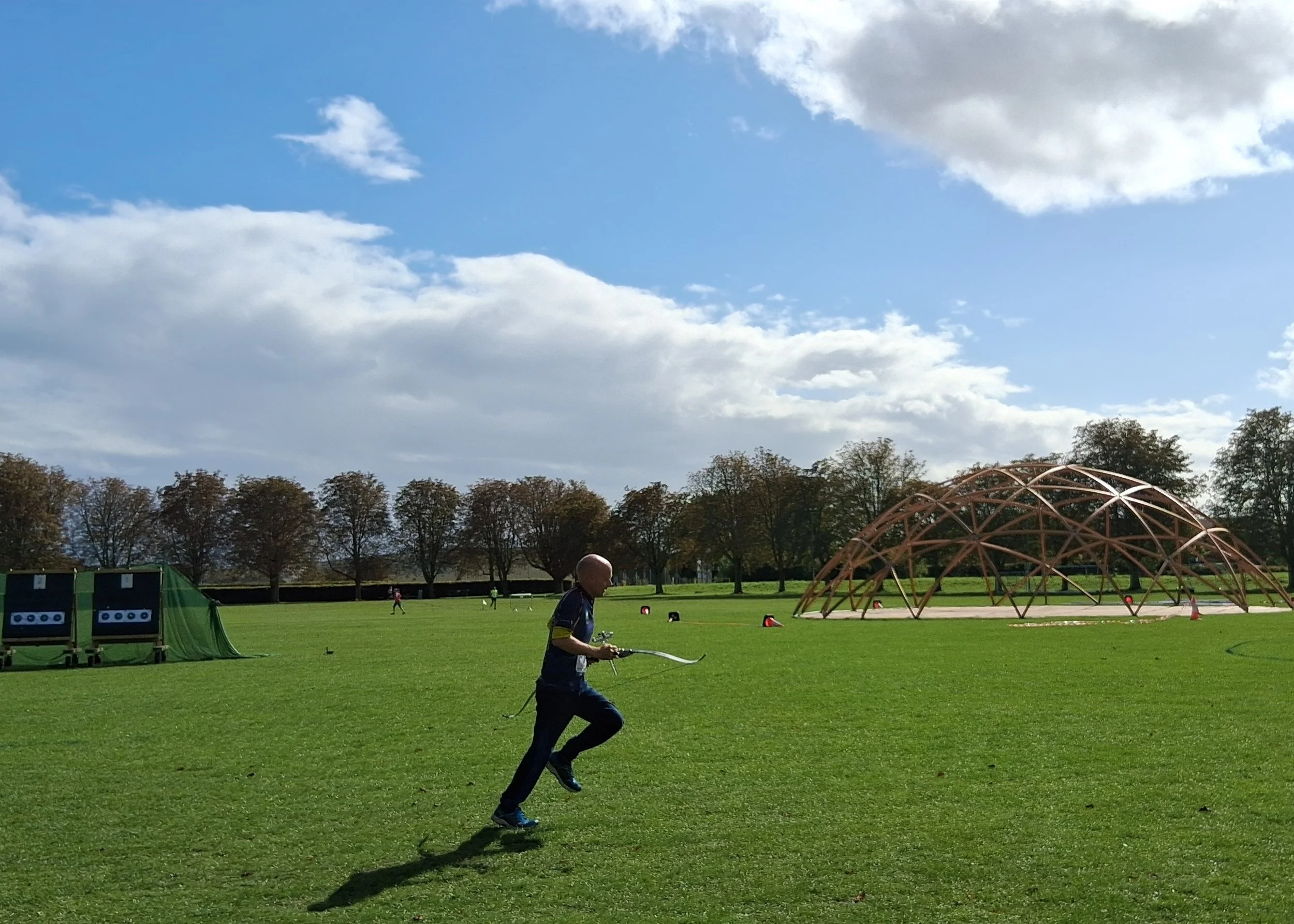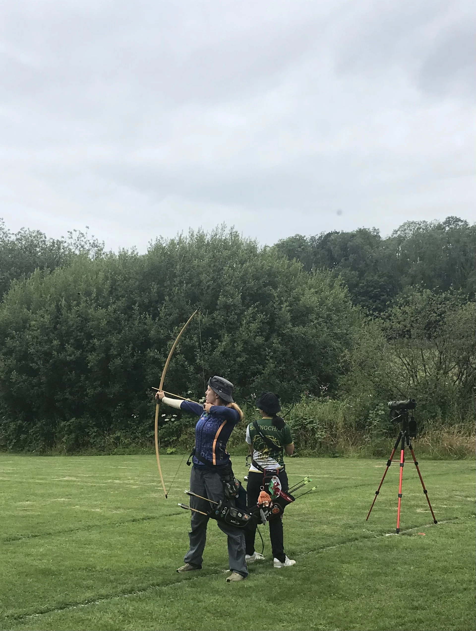 Further down the range, as the targets stretched away, John H battled through to win silver, coming second only to the No. 2 ranked 50+ Welsh longbower. He might have edged closer still, had he not been caught in such a riveting conversation that he waited three and a half minutes, only to be reminded he had thirty seconds left to shoot his end — oops.