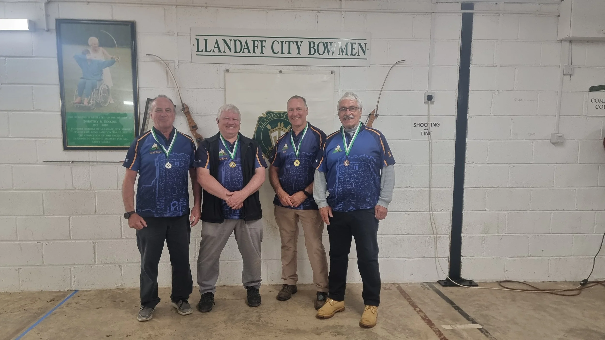 Castle Bowmen Gent Barebows took all the top spaces in their category with Ian M’ taking 4th spot, Karl C’ picking up the Bronze, Chris O’ took a magnificent Silver and Mike Wo’ took home the Gold along with a Welsh record for the Double WA70m.