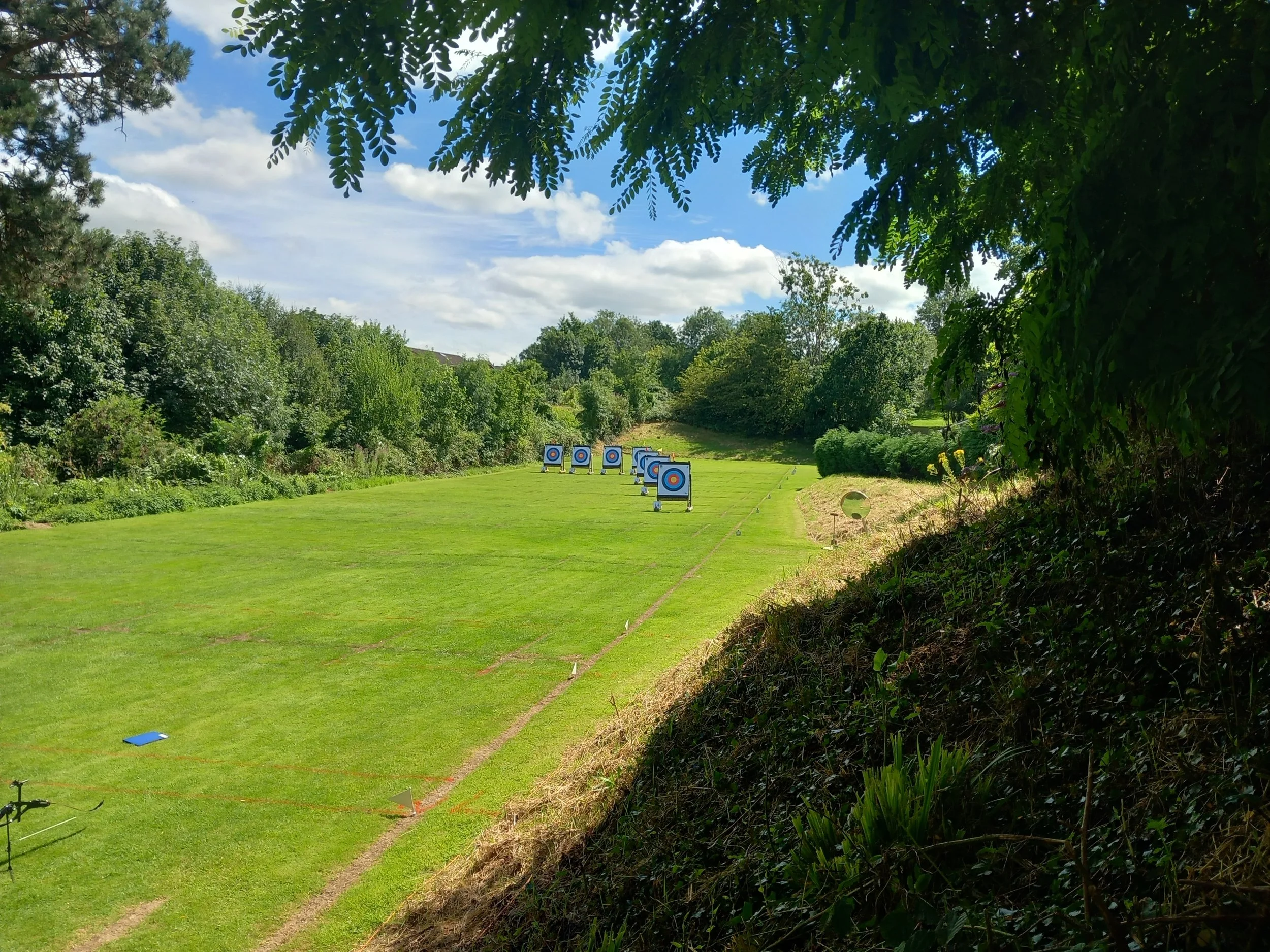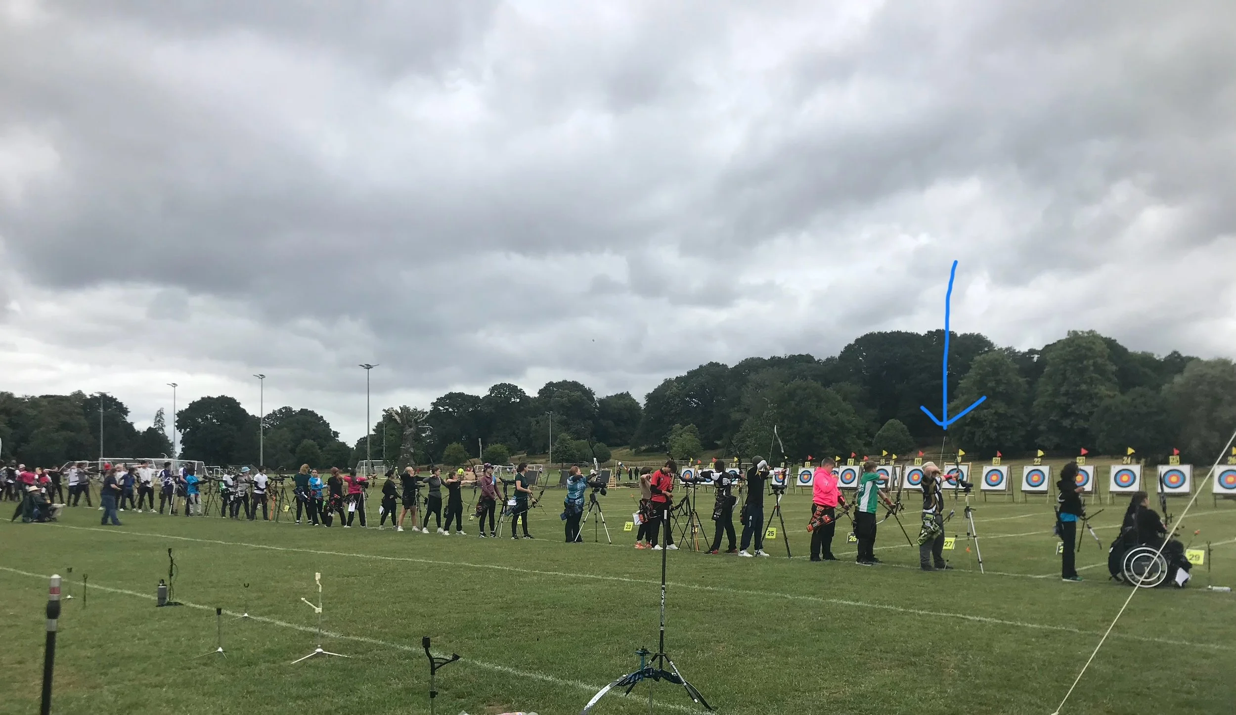 Castle Bowmen arrived at the field to congregate and setup under the shade of a giant bus shelter. Perfectly placed parallel to the shooting line, giving us reprieve from the fiery heat of the sun and from a somewhat blustery wind that kept everyone’s scores in the grumbling zone. Everyone that is, except Becca who beat the breeze for a PB!