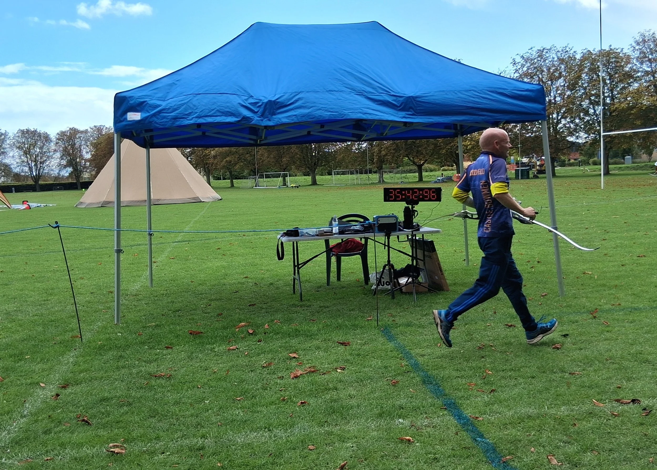 The men assembled at the start line, meanwhile a bitingly cold rain shower decided to make an appearance … I’m sure it’ll pass… The whistle went and the race was on. First round , shoot and knock 4 targets over whilst standing, the slightly more persistent wind decided it would be funny to gust at the wrong moment and make the arrow thud into the backstop..which hadn’t fallen over yet…, so 1 penalty lap was required, not too bad it is windy afterall. 2nd lap, then 4 arrows whilst kneeling, and despite the swirling blustery wind all 4 targets were down - ZERO penalties !! in his triumph Mike hardly noticed the flags were starting to lean at quite the angle due to the wind. One more lap to finish, a little burst of speed to overtake a slower runner only seemed polite (they have to learn), legs a bit heavy due to the cold wind but nothing too bad, until the final corner when the wind had a go at snapping the oak trees. So the final sprint to the finish was more of Why is that finish so far away. Finished with a flourish and only a slight pain in the legs, arms, lungs but it was all done.